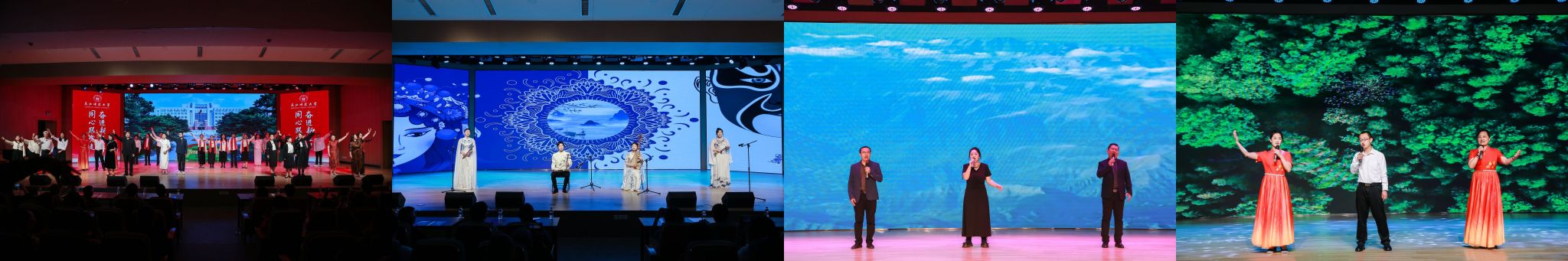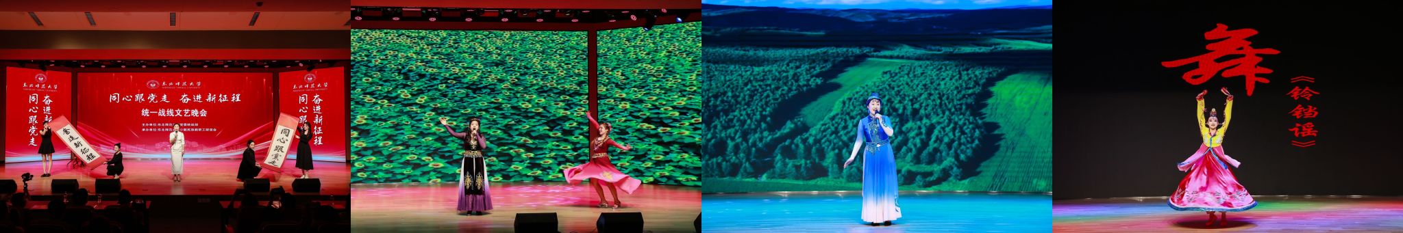 晚会节目涵盖歌曲、民乐、舞蹈、朗诵、书法、武术、乐器独奏等多种艺术形式,各党派团体与师生代表用精彩演出诠释了“同心向党”的坚定信念。学校统战系统三十余位教师首先带来合唱《不忘初心》,全场共同重温信仰力量,续写时代荣光;音乐学院民乐团演奏的新民乐《京韵》,传统乐器与现代编曲碰撞,尽显中华文化独特韵味;民盟东北师大委员会、民建东北师大支部、校台联分别带来《同一首歌》《阳光总在风雨后》《明天会更好》歌曲联唱,传递出统战成员心手相连、共迎美好未来的心声;校党外知识分子联谊会表演配乐诗朗诵《沃土》,深情诉说东师八十年从延安到长春的开拓历程,致敬一代代东师人的育人初心;农工党东北师大支部带来蒙古族群舞《走马》,以刚健舞姿展现草原文化的豪迈与热情;九三学社东北师大委员会的吉他弹唱《我爱你中国》,民进东北师大基层委员会同步进行的“同心跟党走 奋进新征程”书法展示,音乐与汉字的交融间,满溢对祖国的炽热深情;校少数民族教职工联谊会带来《一杯美酒》《赞歌》《铃铛谣》歌舞表演和男声二重唱《新路》,用歌声和舞步展现中华文化的丰富内涵和新时代的奋进力量。校欧美同学会带来武术表演《一武尽芳华》,一招一式尽显中华武术的刚健之美与自强不息的民族精神;校侨联带来的大提琴独奏《b小调随想曲》,悠扬乐声带领观众沉浸于艺术想象世界;民革东北师大委员会表演舞蹈《鼓语庆收》,用欢快鼓点与灵动舞步勾勒出丰收的盛景。最后,晚会在全体演员和观众合唱《歌唱祖国》《没有共产党就没有新中国》的热烈氛围中落下帷幕。
